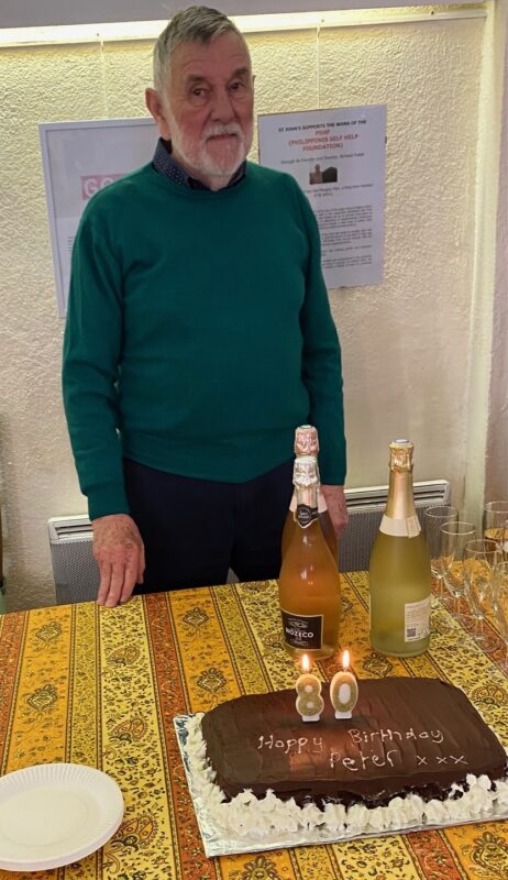 Peter started attending St John’s as a holidaymaker in 1985, with 2/3 visits per year. With his wife, he then moved to France in 2000 and became a full-time member of St John’s, where he served as Treasurer for 20 years, with 6 years off to be Churchwarden. We were delighted to celebrate his 80th birthday after church on 22 February in the usual way – a rousing version of “Happy Birthday”, a delicious birthday cake, and either alcoholic or non-alcoholic “fizz”.